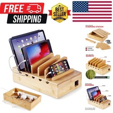 Bamboo Charging Station for Multiple Devices Natural Wood Device Organizer, D...
