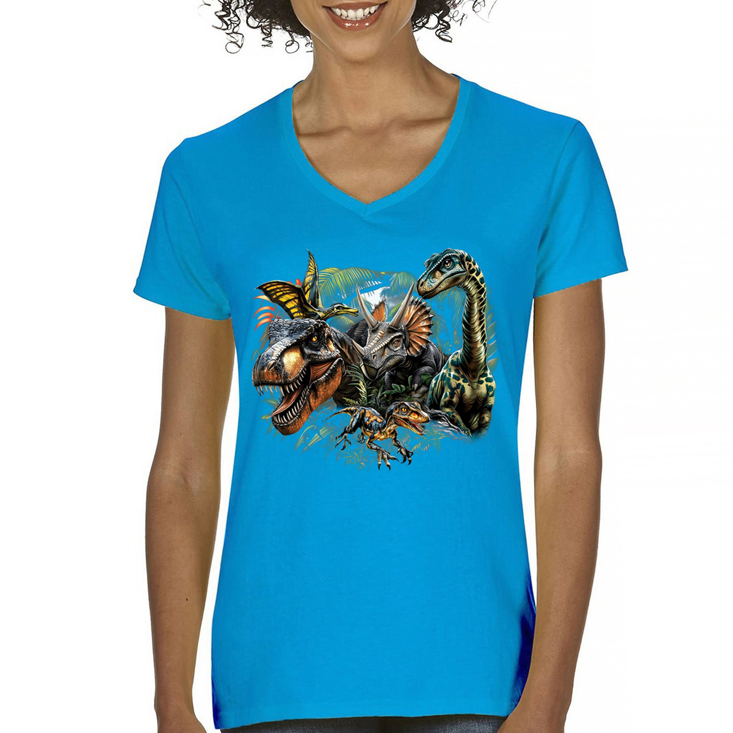 Dinosaur Jungle Women's V-Neck T-shirt T-Rex Triceratops Brachiosaurus Tee