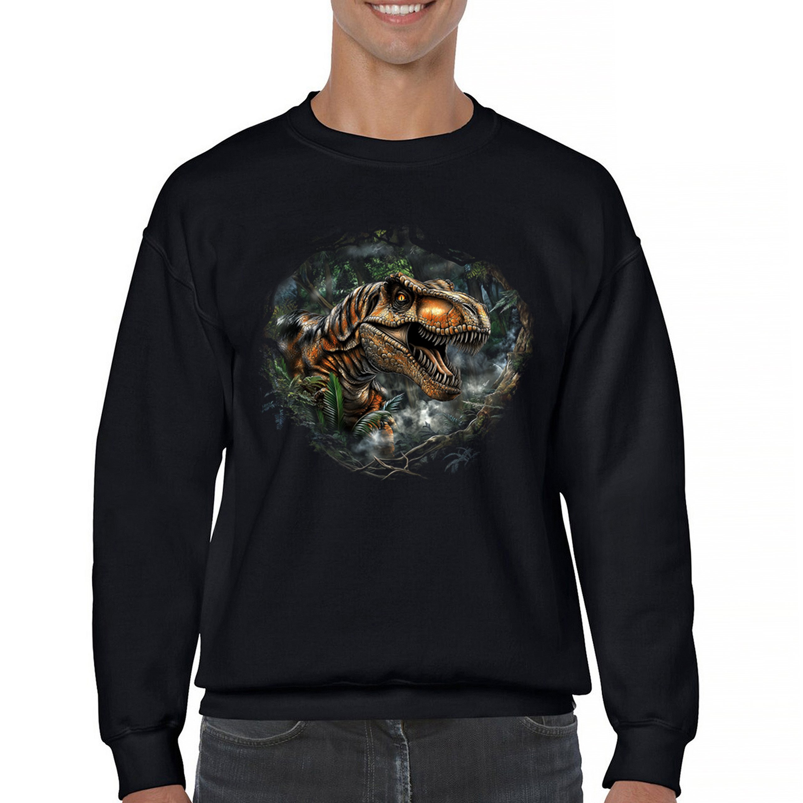 T-Rex Jungle Sweatshirt Roaring Dinosaur Tropical Predator Jurassic Crewneck