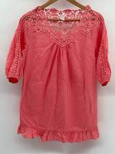 Sundance Top Crochet Women Size Medium Pink Coral Short Sleeve Cotton V Neck