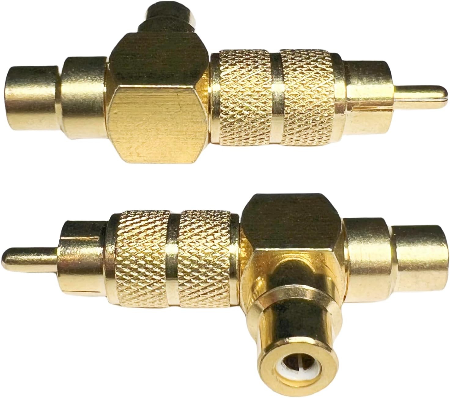 T-Shape RCA Splitter Adapter – Splits one male RCA signal into two female jacks, allowing you to use one RCA input for two outputs. Right-Angle Design – Compact and angled design is perfect for tight spaces, reducing strain on cables and connectors.