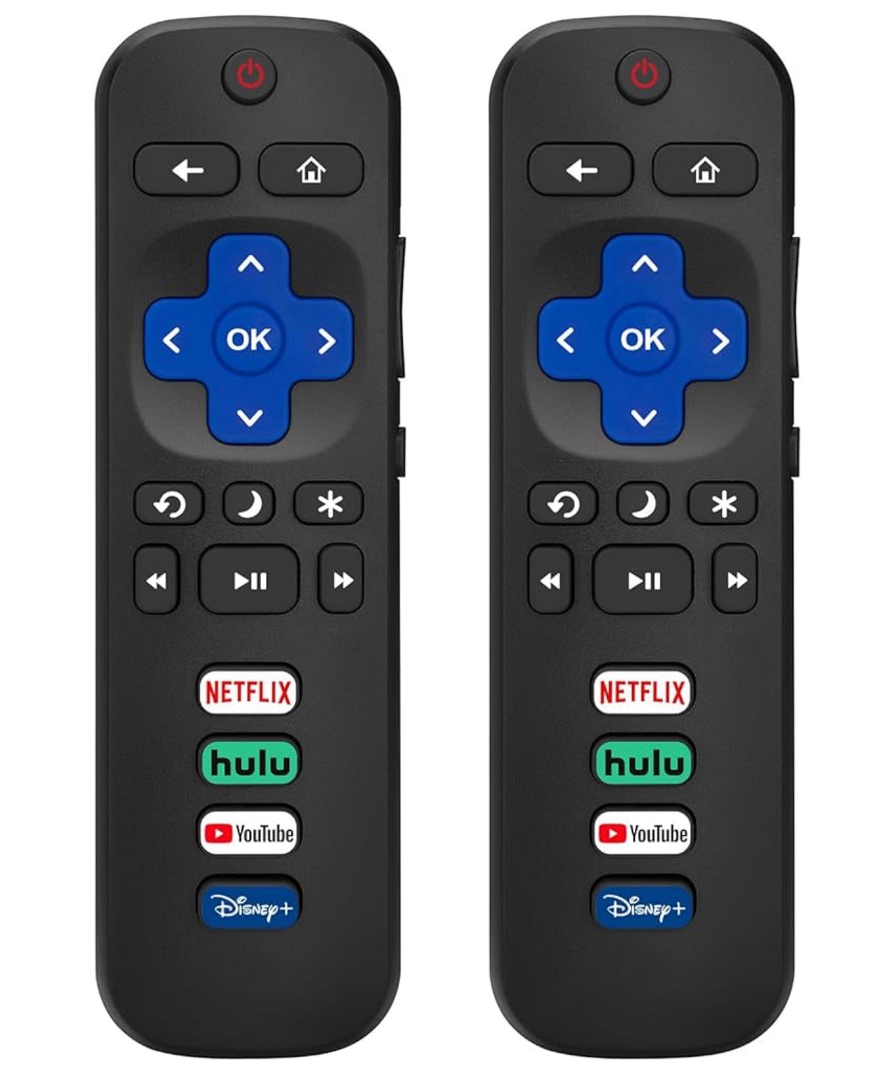The 2-pack Remote Control Replacement for Roku TV is a standard IR remote designed for TCL, Hisense, Onn Roku, and other compatible brands. This remote is not for the Roku stick/ player. It features a slim and comfortable grip design with a top red power button and full navigation pad for easy control. The remote includes buttons for Netflix, Hulu, Disney+, and Prime Video, as well as streaming shortcuts for added convenience. With a wireless range of 5-10 meters, this remote is plug-and-play ready and operates with an infrared signal type. The package includes 2 black remote controls made of plastic material. Batteries are not included.